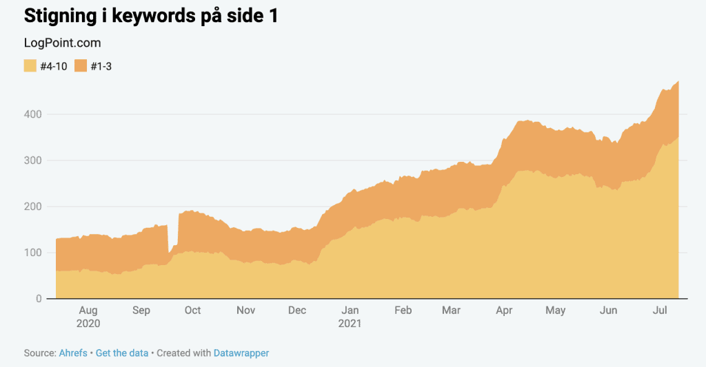 Vi ser också en imponerande tillväxt i sökord på sidan 1 för Logpoint. När vi började i augusti 2020 rankades Logpoint på 136 sökord på sidan 1. I början av juli 2021 rankas Logpoint på 461 sökord på sidan 1. Det betyder att vi ser en ökning med inte mindre än 238,97% under vår 11 e månad tillsammand med Logpoint. Samarbetet med Logpoint kan minst sagt beskrivas som en stark SEO-insats.