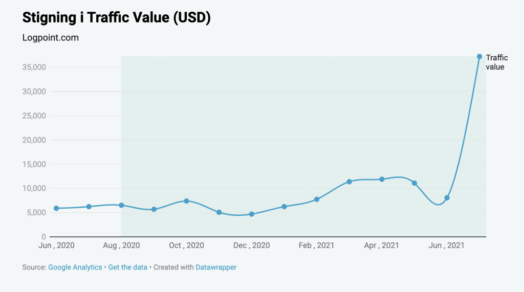 Trafiken till Logpoint har ökat betydligt varje månad sedan vi startade samarbetet. Om vi jämför juni 2020 med juni 2021 ser vi inget mindre än en ökning av organisk trafik på 477,59.