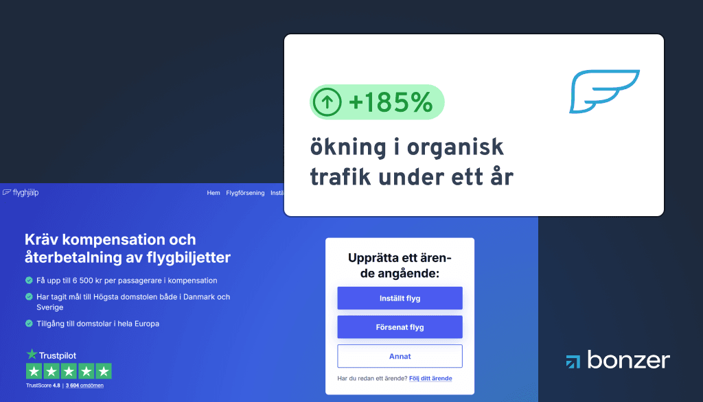 I februari 2025 inledde Bonzer ett samarbete med Flyghjälp med ambitionen att etablera dem som Sveriges ledande expert inom ersättning vid flygförseningar och inställda flyg. Genom en datadriven SEO-strategi fokuserad på högkonverterande sökord inom flygförseningar och passagerarrättigheter, har vi systematiskt tagit kontroll över söklandskapet. Genom att kombinera teknisk spetskompetens med auktoritativt innehåll har vi inte bara drivit en kraftig trafiktillväxt, utan även stärkt Flyghjälps position som en av de marknadsledande inom flygersättning.