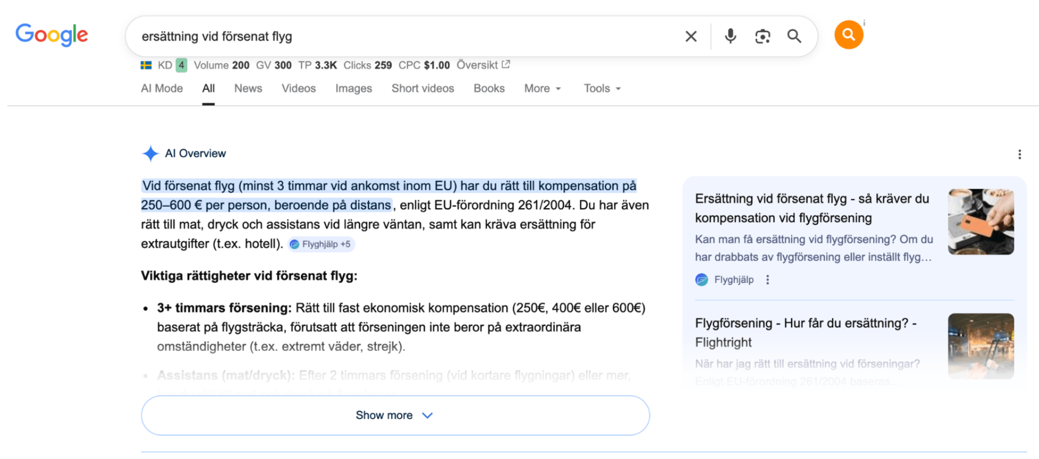 Ett annat resultat av vårt samarbete är att Flyghjälp nu syns i Googles AI-översikter för flera av de sökord vi har prioriterat i arbetet. Det visar att SEO-strategin inte bara förbättrar den organiska synligheten, utan också att innehållet uppfattas som relevant och trovärdigt när Google sammanställer AI-genererade svar. Att synas i AI-översikter stärker Flyghjälps synlighet och auktoritet inom flygförseningsbranschen, vilket i förlängningen kan bidra till fler besökare och potentiella konverteringar.